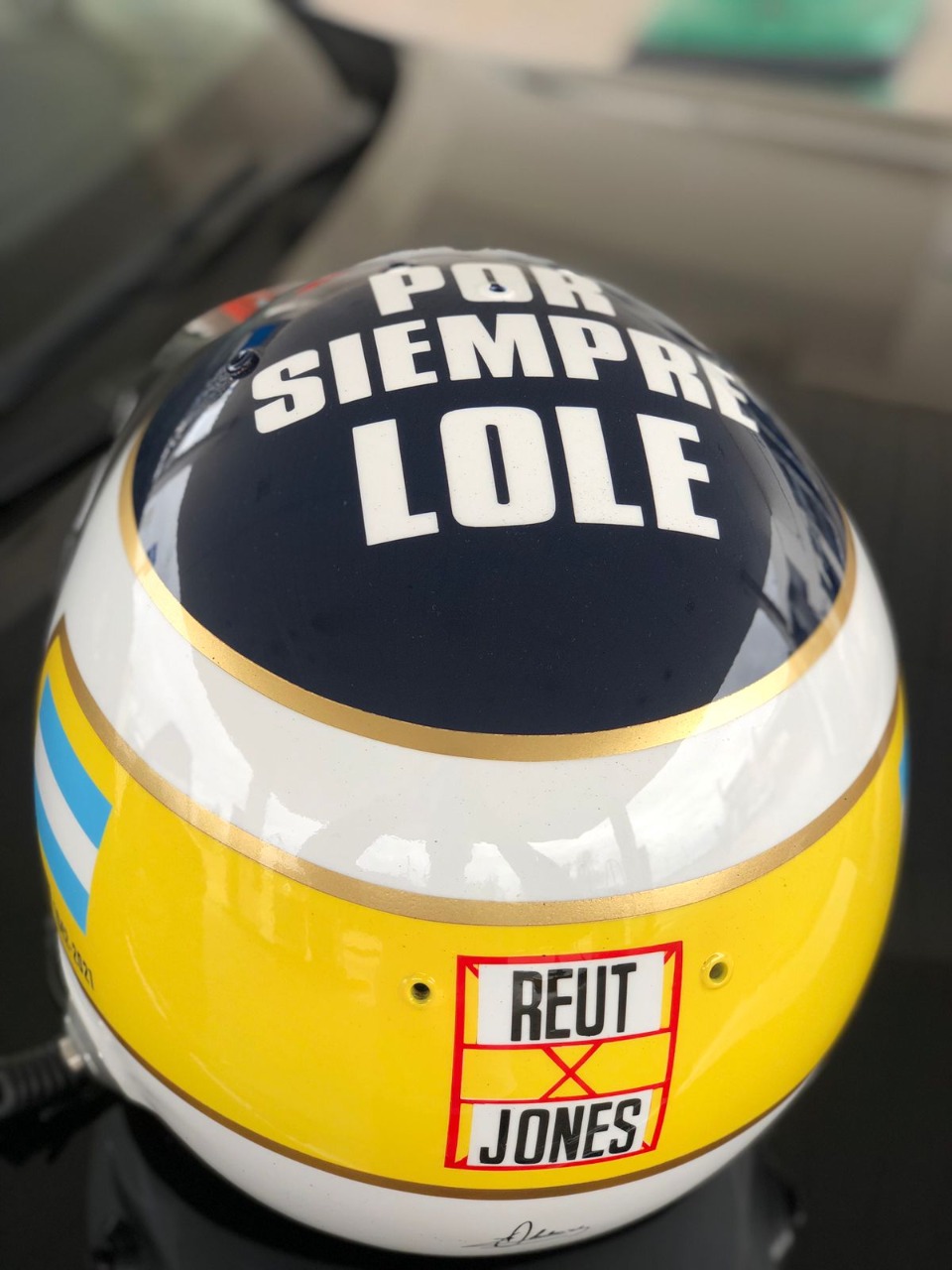 El casco fue diseñado por Germán Rodoni, el reconocido aerógrafo que planteó una réplica con los colores que utilizaba Reutemann y en la parte de arriba expresa «por siempre Lole».
