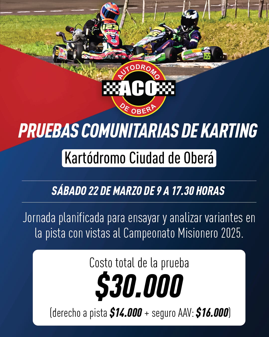 El Automóvil Club Oberá (ACO) programó pruebas comunitarias de karting para el próximo sábado 22 de marzo de 9 a 17.30 en el kartódromo Ciudad de Oberá.